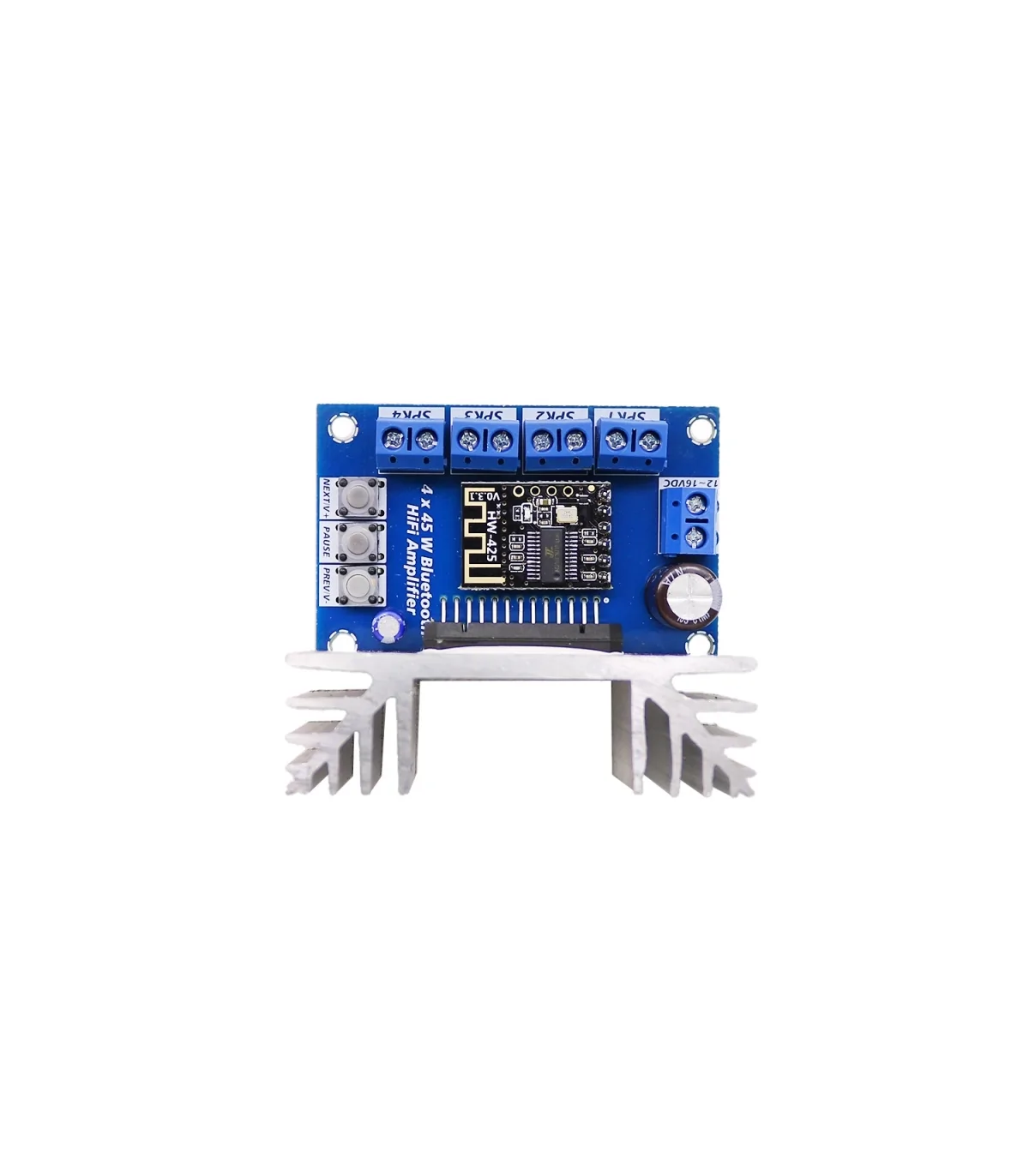 این امپلی فایر بلوتوثی بر اساس تراشه پرقدرت TDA7388 با 4 خروجی و 45 وات توان طراحی گشته است. این تراشه یکی از پرکاربردترین تراشه های آمپلی فایر در صنعت خودرو سازی بوده .