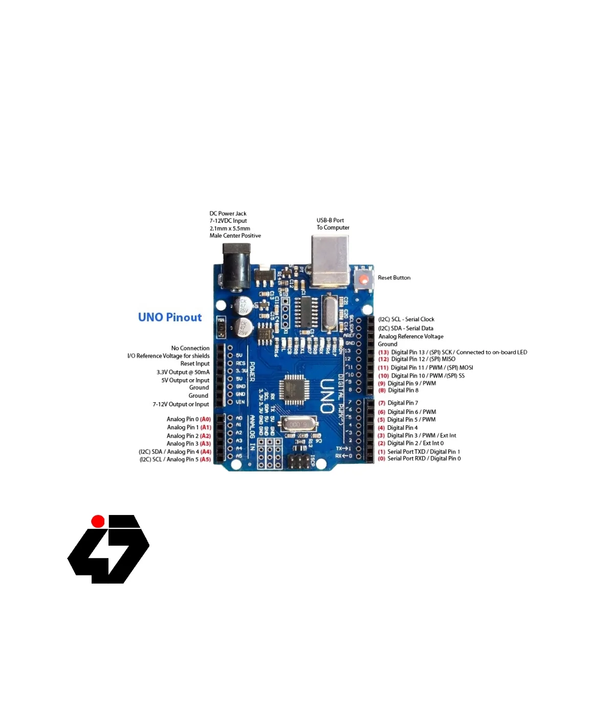 برد آردوینو UNO بر پایه میکروکنترلر ATmega328 ساخته شده است .آردوینو uno دارای 14 پین ورودی و خروجی دیجیتال، 6 پین ورودی آنالوگ، ، یک کریستال 16مگاهرتز، یک پورت USB، یک پاورجک (ورودی منبع تغذیه)، یک ICSP header و یک دکمه ریست می باشد.برد آردوینو UNO (آردوینو یونو)برای کسانی که تازه شروع کرده اند مناسب ترین برد خانواده آردوینو می باشد و از لحاظ قیمت و امکانات، مقرون به صرفه ترین برد به حساب می آید.