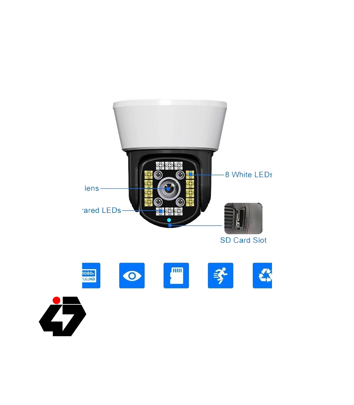 دوربین سیم کارتی 4G V380 دوربین انلاین چرخشی هم می باشد که تا 350 درجه افقی و 90 درجه عمودی می تواند چرخش داشته باشد.شما این چرخش را می توانید از طریق برنامه در موبایل خود در هر کجای دنیا انجام دهید.این دوربین دارای لنز 2 مگاپیکسل است .همچنین با داشتن8 عدد LEDسفید و 6 عدد LED مادون قرمز دید در شب رنگی و شفافی را به شما تحویل می دهد .