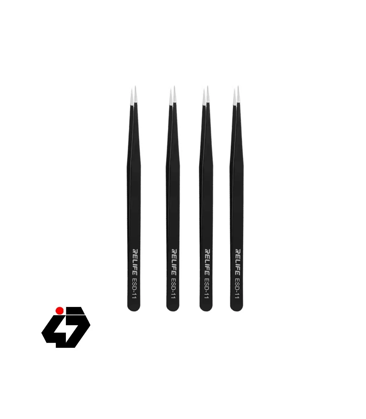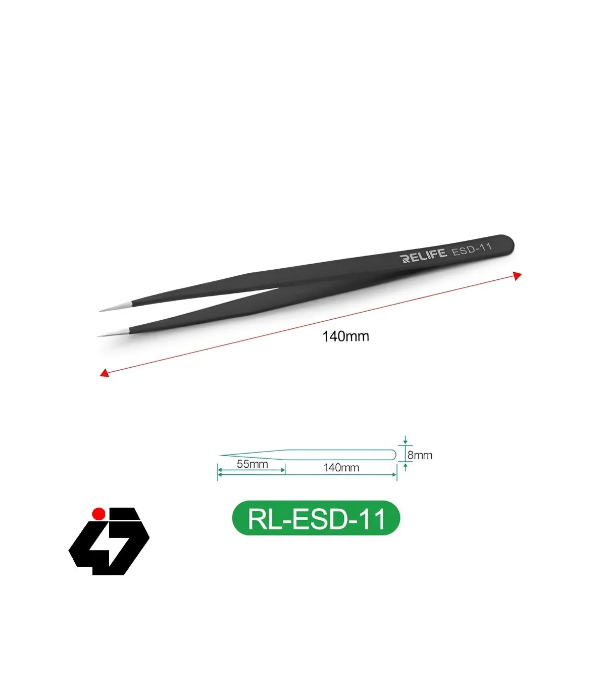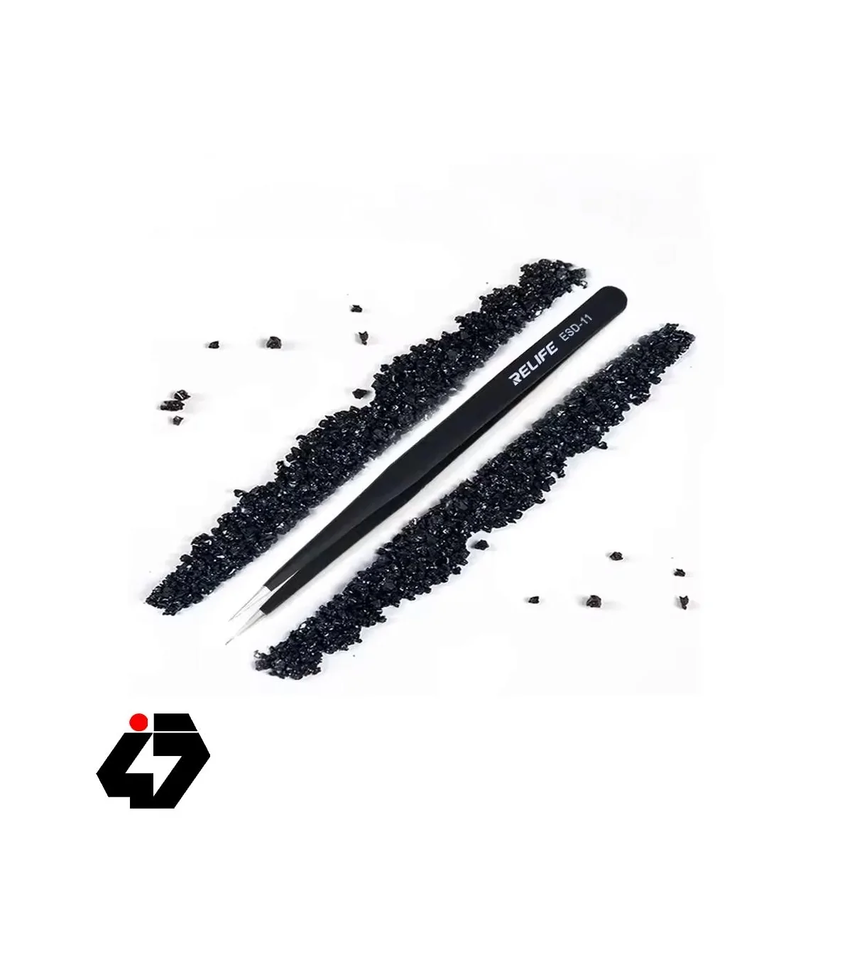 پنس RELiFE ESD-11 از فولاد ضد زنگ با روکش مشکی مات آنتی استاتیک ساخته شده و مطابق استاندارد ESD Safe طراحی شده است تا از تخلیه الکتریسیته ساکن و آسیب به قطعات حساس جلوگیری کند.