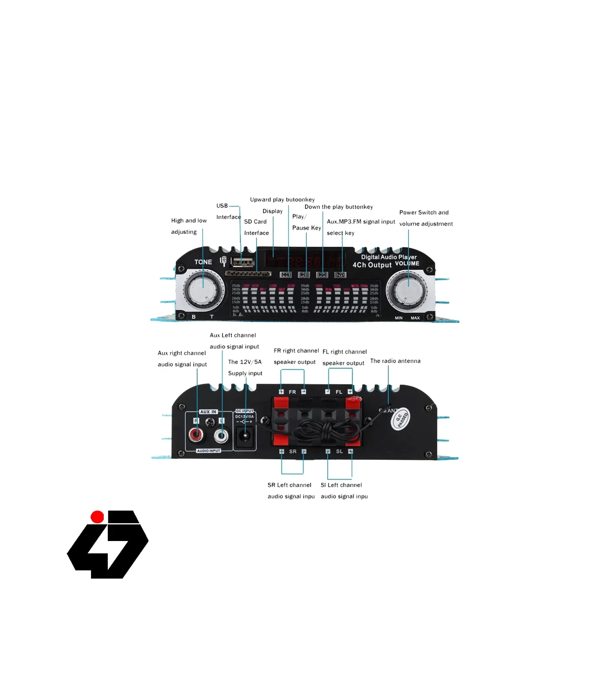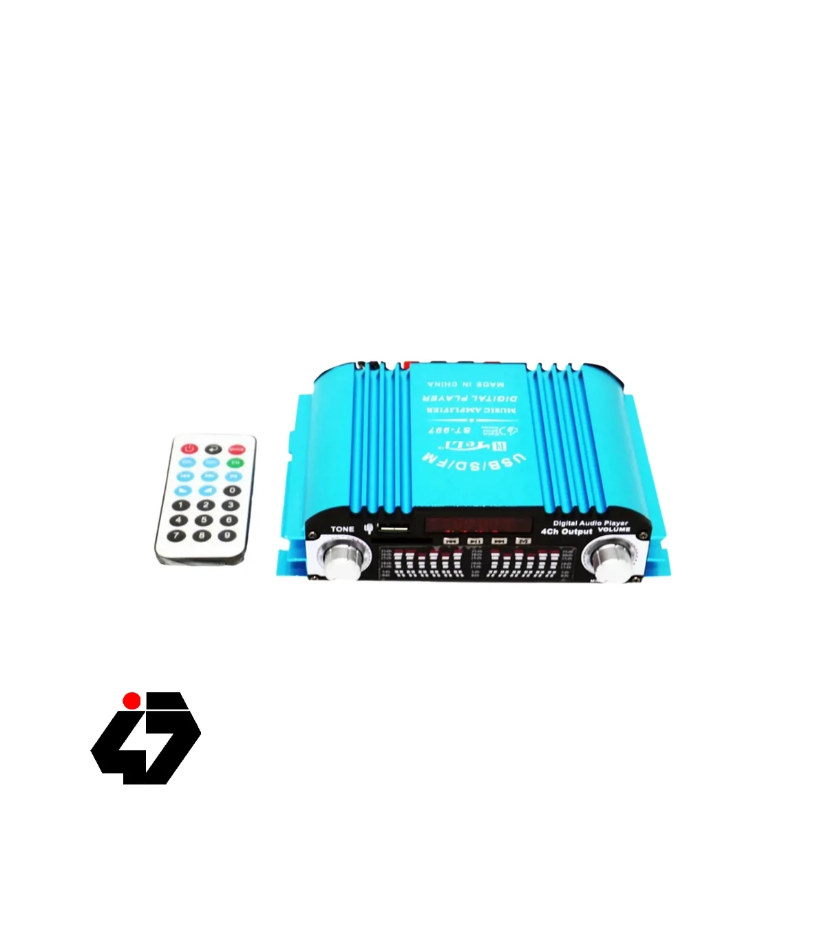 تقویت کننده صوتی 4 کانال 80 وات با ولتاژ کاری 12 ولت دارای ورودی USB و AUX و کارت حافظه SD و گیرنده رادیویی.