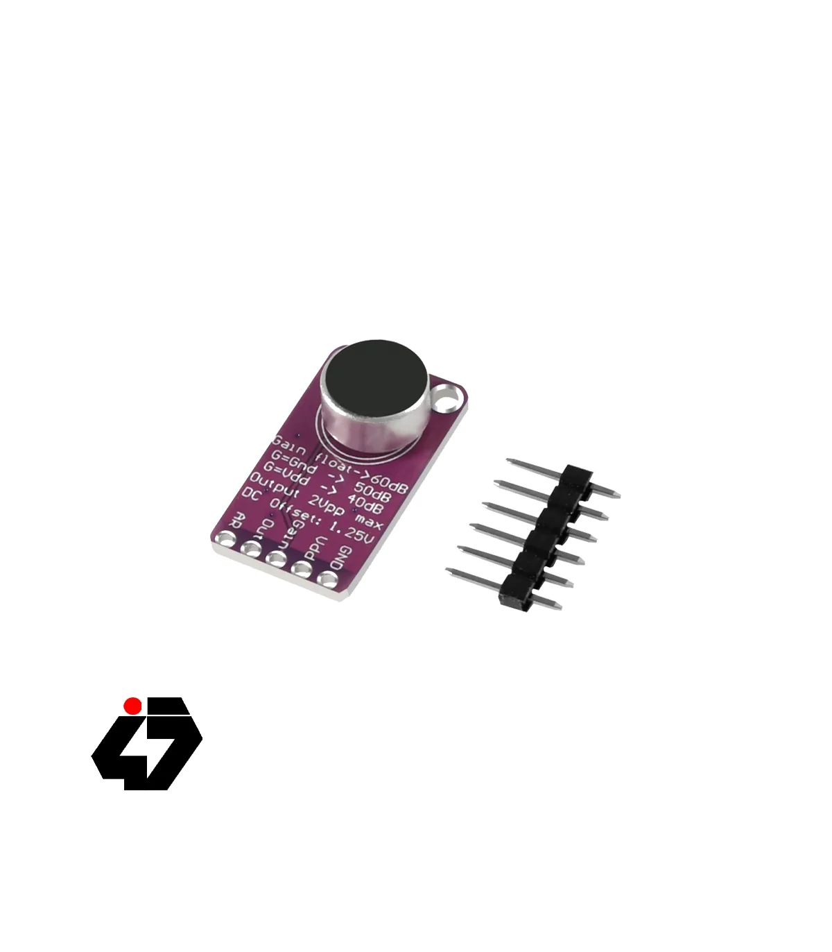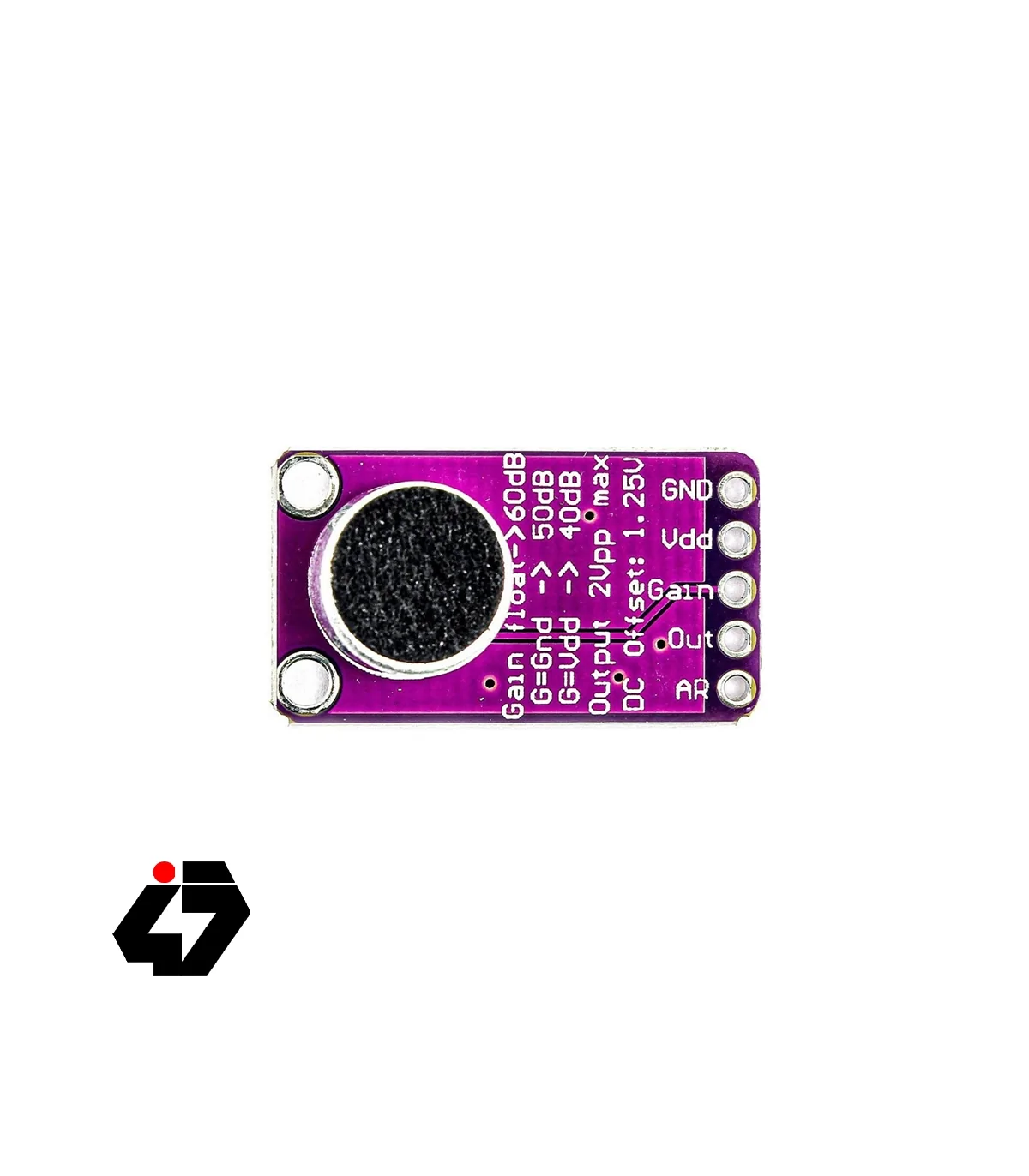 این ماژول دارای یک میکروفن با دامنه صدای تقویت شده است و به کمک آمپلی فایر روی ماژول دامنه ولتاژ صدای خروجی تا 2 ولت افزایش می یابد. تغذیه ماژول از 2.7 تا 5.5 ولت است و میکروفون سطح نویز پایینی دارد.