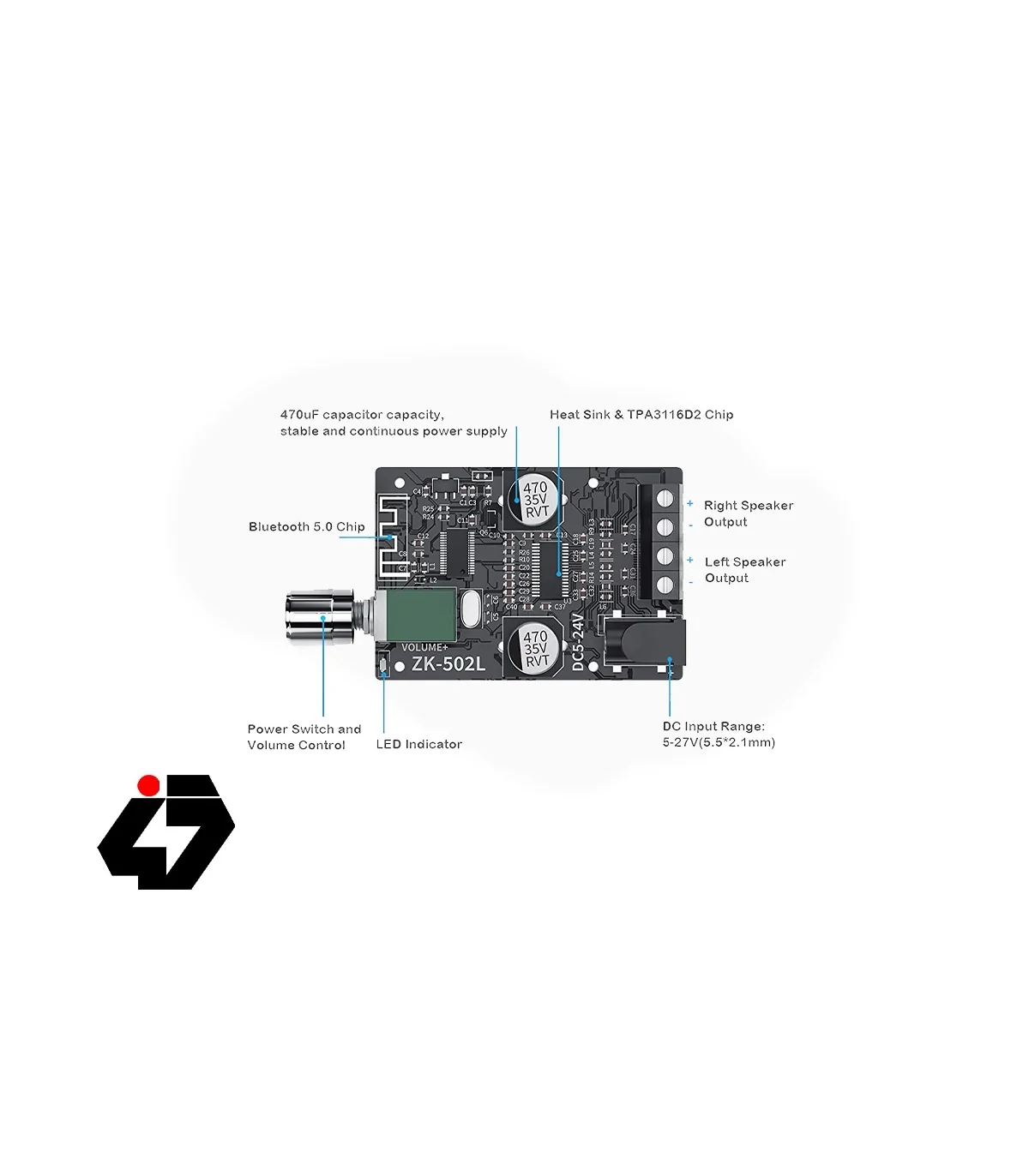 ماژول بلوتوث ZK-502L دارای توان خروجی متناسب با ولتاژ ورودی است که میتوانید از طریق بلوتوث به این ماژول متصل شوید و صدا را با استفاده از خروجی سیمی جهت اتصال به آمپلی فایر استفاده نمود .