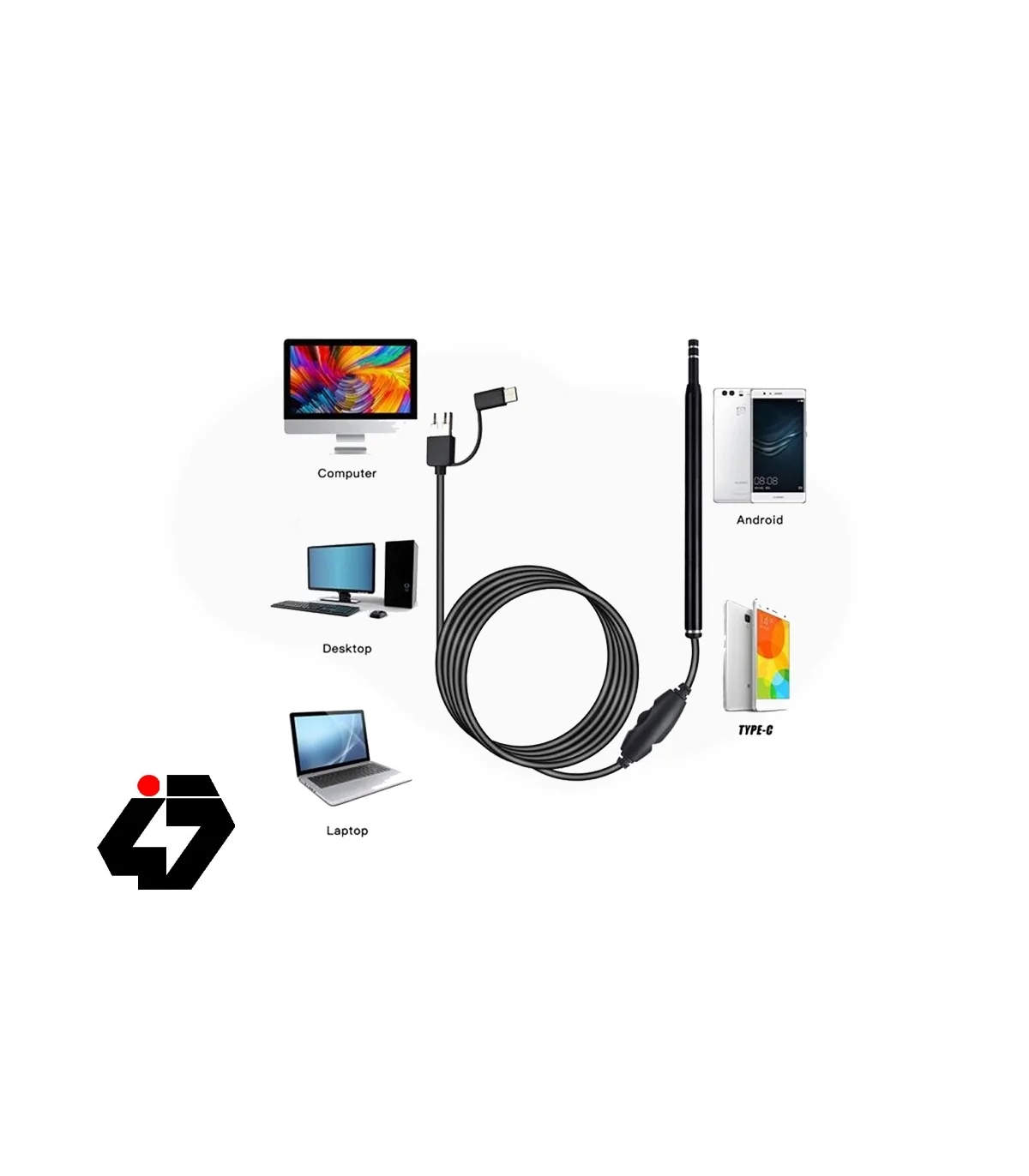 دوربین اندوسکوپی با قطر لنز 5.5mm و رزولیشن 640x480 ، قابلیت اتصال به کامپیوتر و گوشی های اندروید (از طریق OTG) با سه خروجی USB ، TYPE-C و MICRO USB ، امکان عکس برداری و فیلم برداری توسط نرم افزار