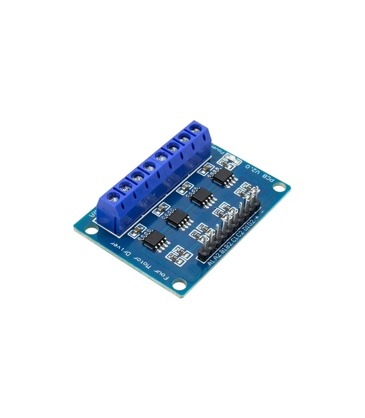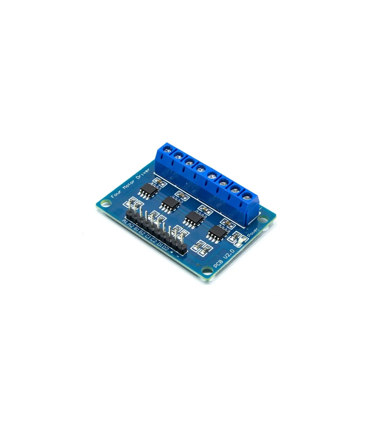 The L9110 ,4 channel motor driver module can be operated from 2.5 V to 12 V which enables it to be used both with 3.3 V and 5 V microcontrollers. This board contains two independent chips which can each drive up 800 mA of continuous current. This board has four holes designed for easy mounting.