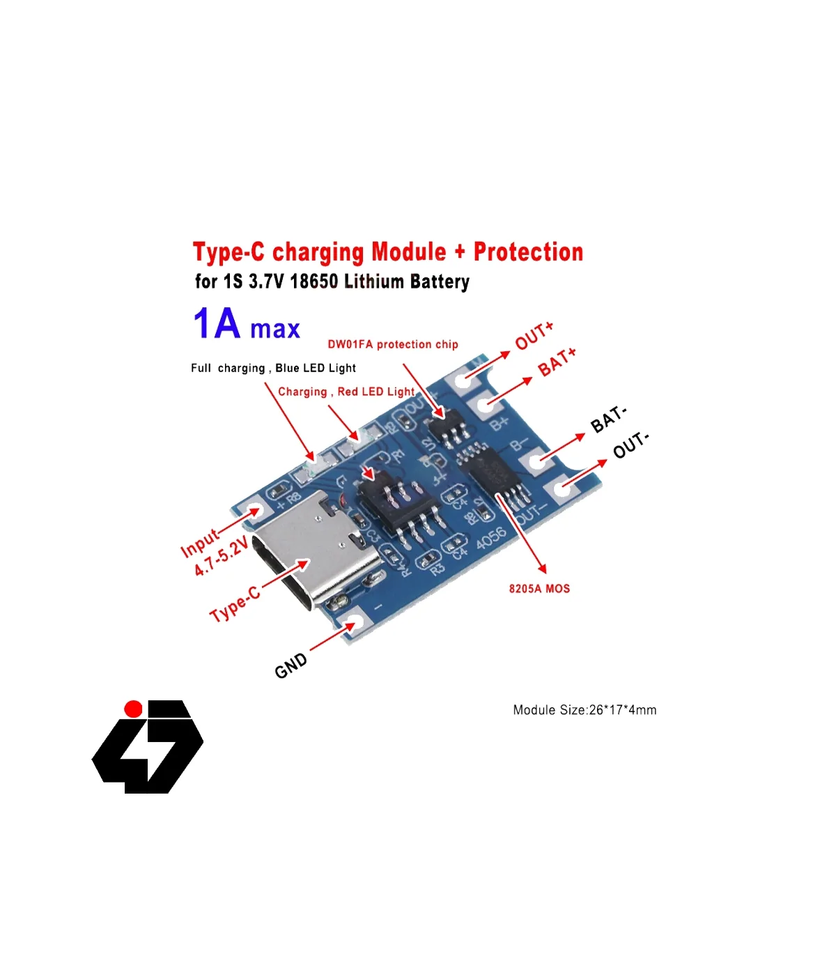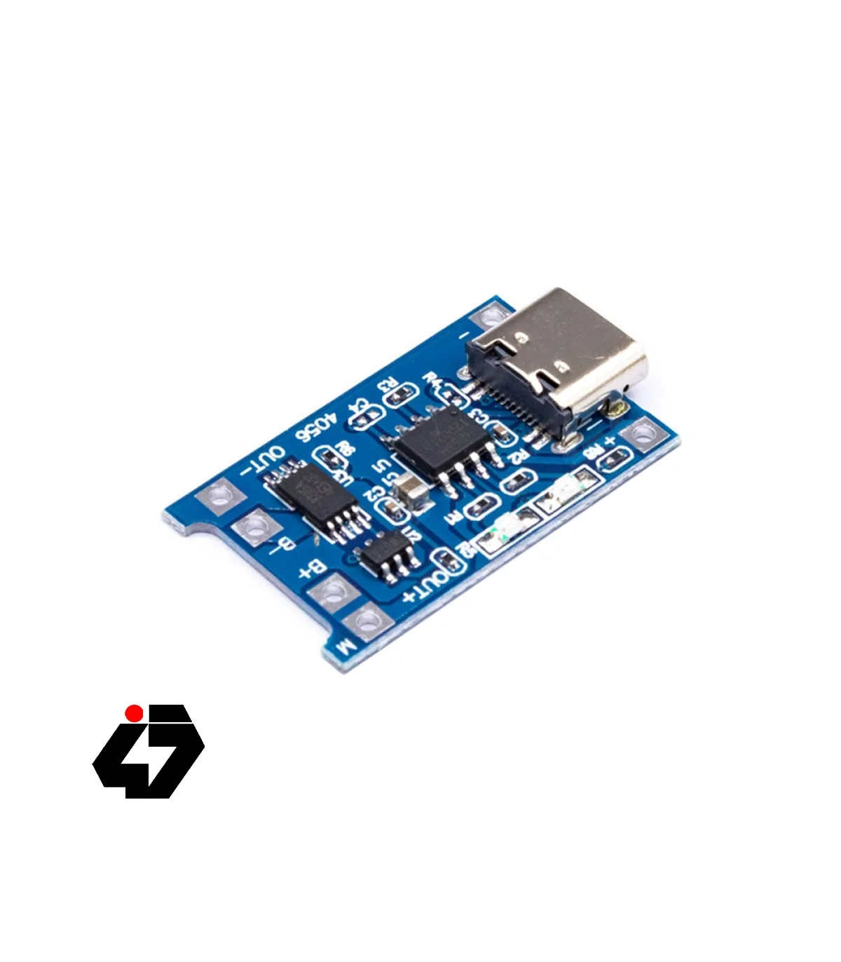 با این ماژول می توانید به راحتی باتری های لیتیومی را شارژ کنید. ماژول تغذیه 5 ولتی خود را از طریق سوکت USB تامین می کند و همچنین می توانید از پین های کناری سوکت جهت اعمال ولتاژ استفاده کنید.