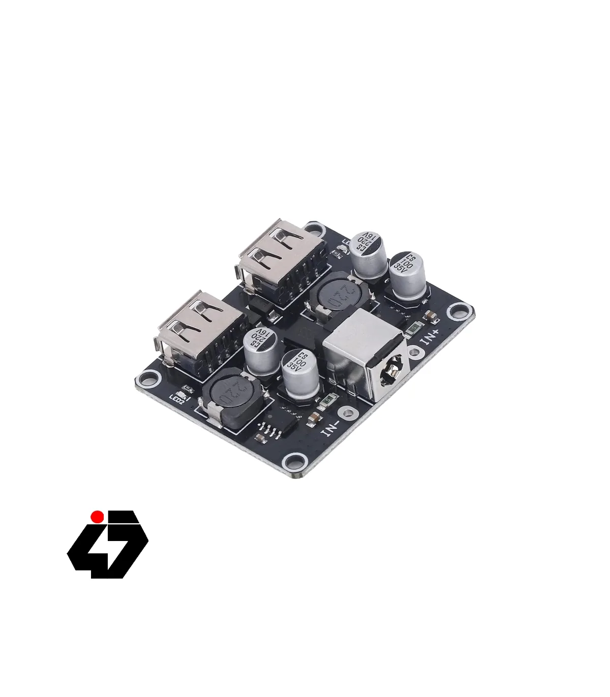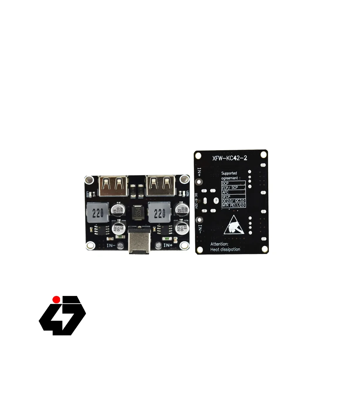 ماژول فست شارژ QC2.0 QC3.0 با توان 24W دو کاناله است. ولتاژ ورودی نیازمند 4.5 تا 32 است. جریان ورودی 4 آمپر و جریان خروجی 4V3.6A/5V3.4A/9V2.4A/12V2A است. این ماژول با تراشههای فست شارژ کوالکوم نسل 3 و نسل 4 سازگاری دارد. به عبارتی خروجی ماژول فست شارژ به صورت هوشمند با تلفن همراه سازگار شده و ولتاژ و جریان خروجی تنظیم میشود. توان ماژول فست شارژ 24 وات و دو کاناله است. برای راه اندازی این ماژول نیازمند منبع تغذیه با توان 24 وات به بالا هستید. بنابراین در کنار این کالا کافیست از آداپتور 24 ولت 6 آمپری استفاده کنید.