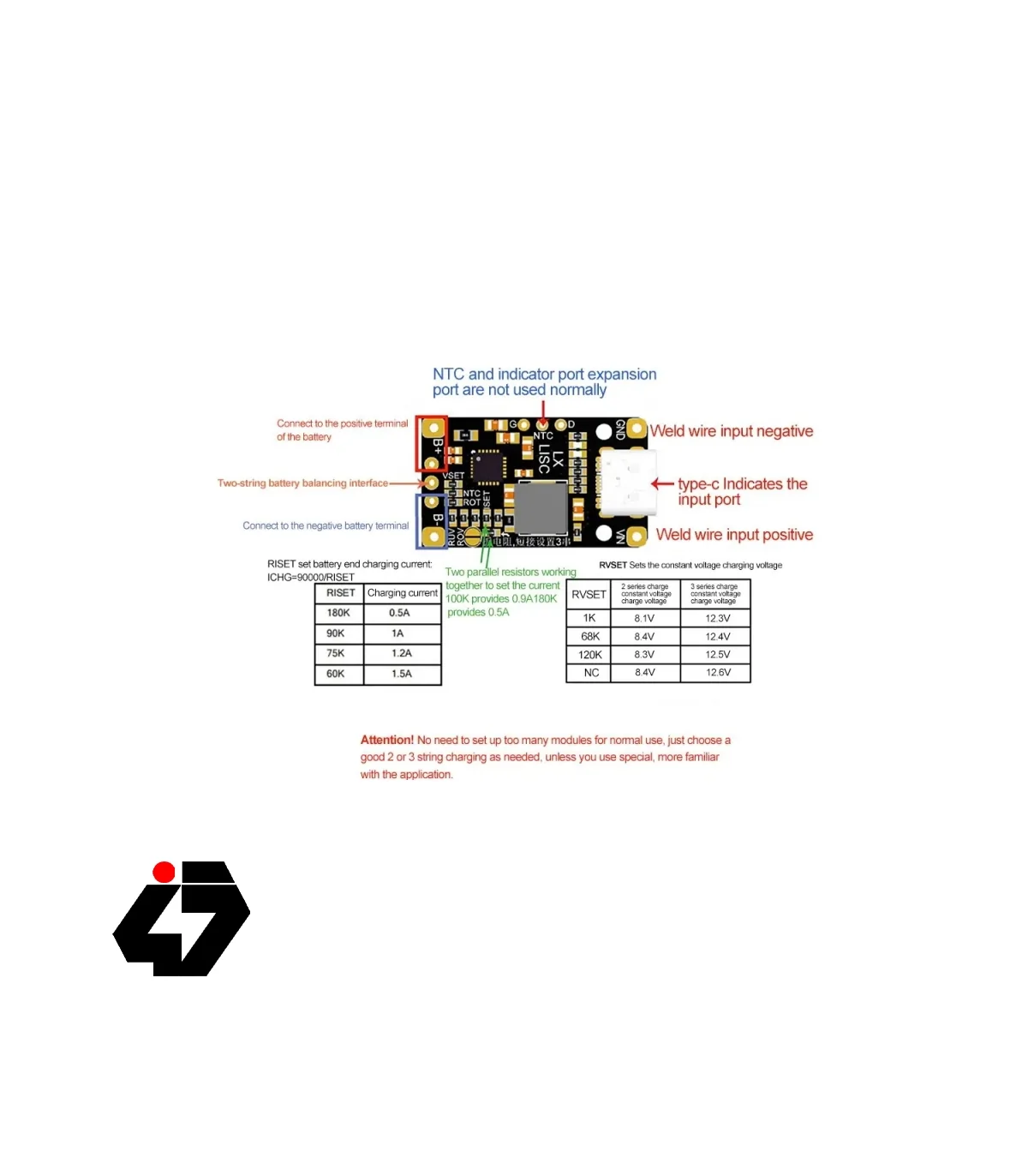 Supports two types of battery cells (2S and 3S) and balanced charging capability in 2S mode.