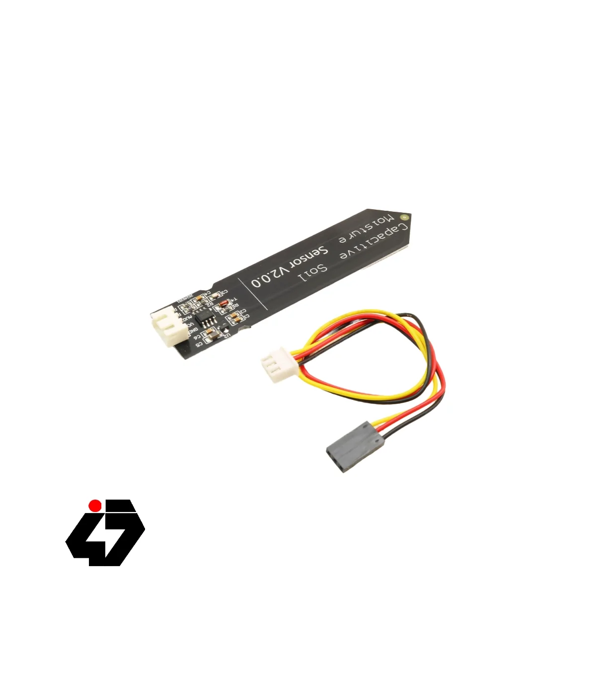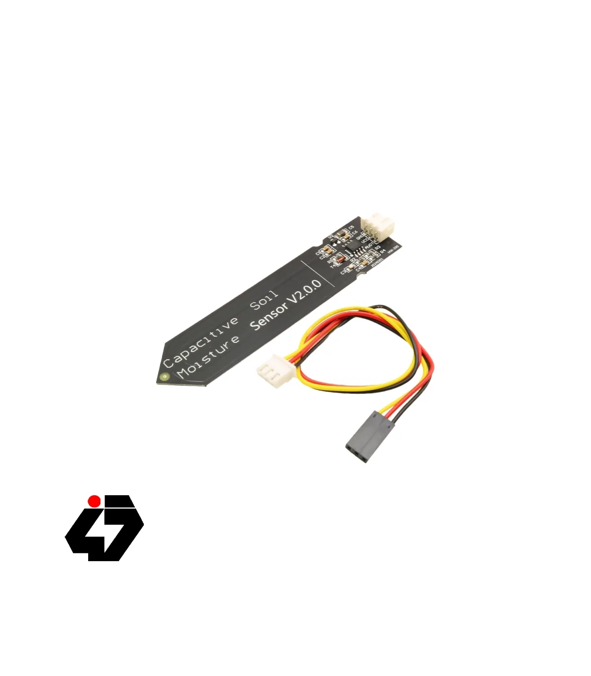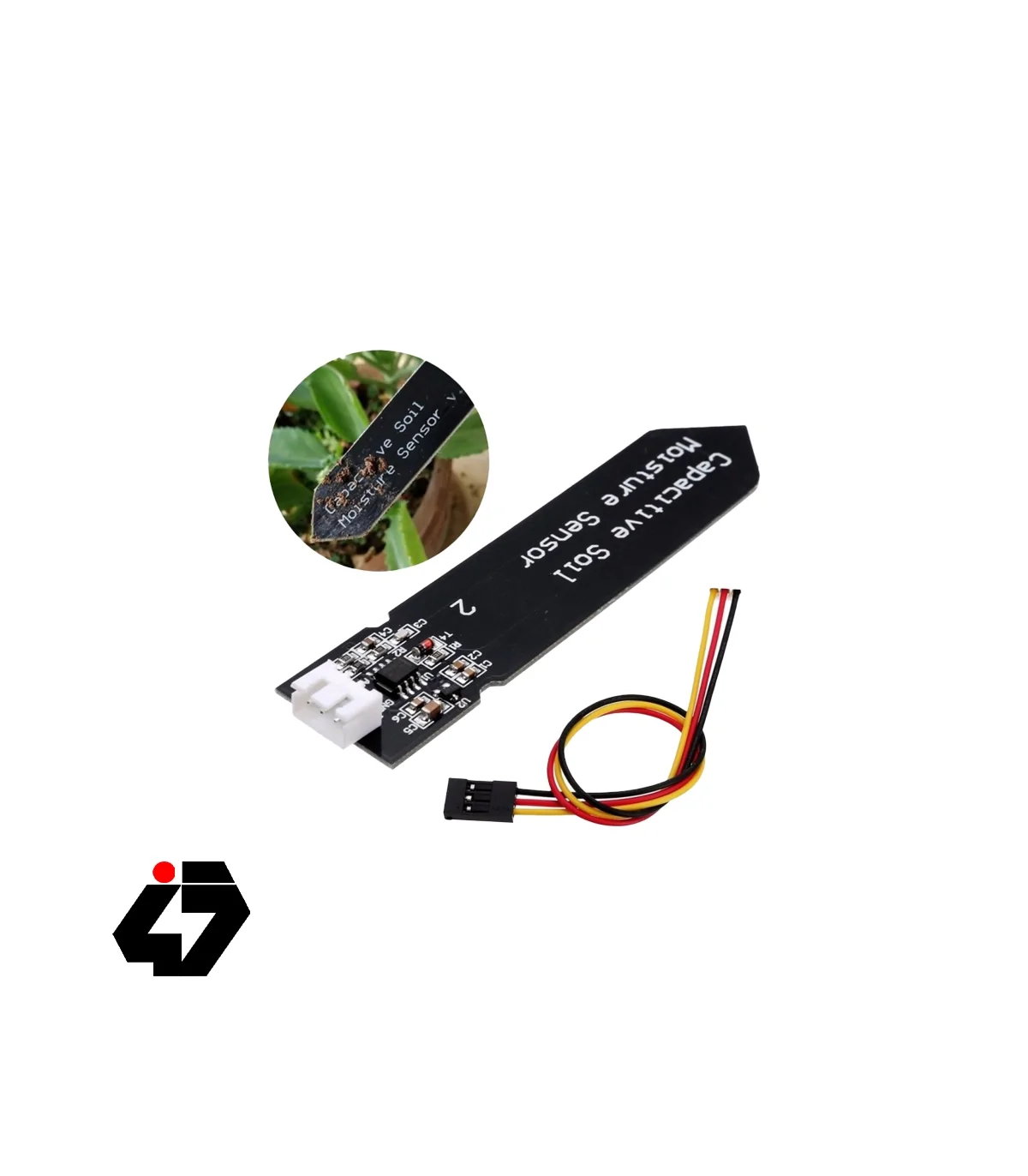 این ماژول به کمک قسمت الکترودی خود می تواند میزان رطوبت خاک را اندازه گیری کند، با استفاده از این سنسور، یک میکروکنترلر، یک رله و یک پمپ آب ساده می توانید سیستم گلخانه ای خود را بصورت هوشمند کنترل کنید. یک ماژول با پراب به طول حدودی 7 سانتی متر این امکان را در اختیار قرار می دهد که به وسیله آن بتوانید مقدار رطوبت خاک را اندازه گیری نمایید. در ماژول اندازه گیری رطوبت خاک خازنی بر خلاف ماژول های مقاومتی نیازی به برقراری تماس سطح مس با خاک نیست بنابراین در برابر زنگ زدگی و اکسید شدگی مقاوم تر می باشد. این ماژول با ولتاژ 3.3 ولت تا 5 ولت سازگار بوده و یک کانکتور سه پین دارد که دو تای آن تغذیه و یک پایه خروجی آنالوگ می باشد. خروجی این سنسور آنالوگ می باشد و ولتاژ خروجی آن بین صفر تا 3 ولت می باشد. این ماژول مناسب برای هوشمند سازی گلدان و باغچه ها می باشد. البته برای این منظور به یک برد واسط نیاز میباشد که خروجی آنالوگ این برد را پردازش نموده نمایش دهد و یا می توان با استفاده از یک شیر برقی جریان آب دهی را کنترل نمود.این ماژول به دلیل اندازه گیری آنالوگ، به صورت بدون وقفه، مقدار رطوبت را به شما تحویل می دهد. به دلیل وجود رگولاتور ولتاژ روی ماژول، شما می توانید ولتاژ 3.3 تا 5.5 ولت را به عنوان تغذیه ماژول استفاده کنید. هم چنین این ماژول با ماژول رطوبت خاک DF Robot سری Gravity سازگار می باشد و شما می توانید از کدهای نمونه آن نیز بهره ببرید.