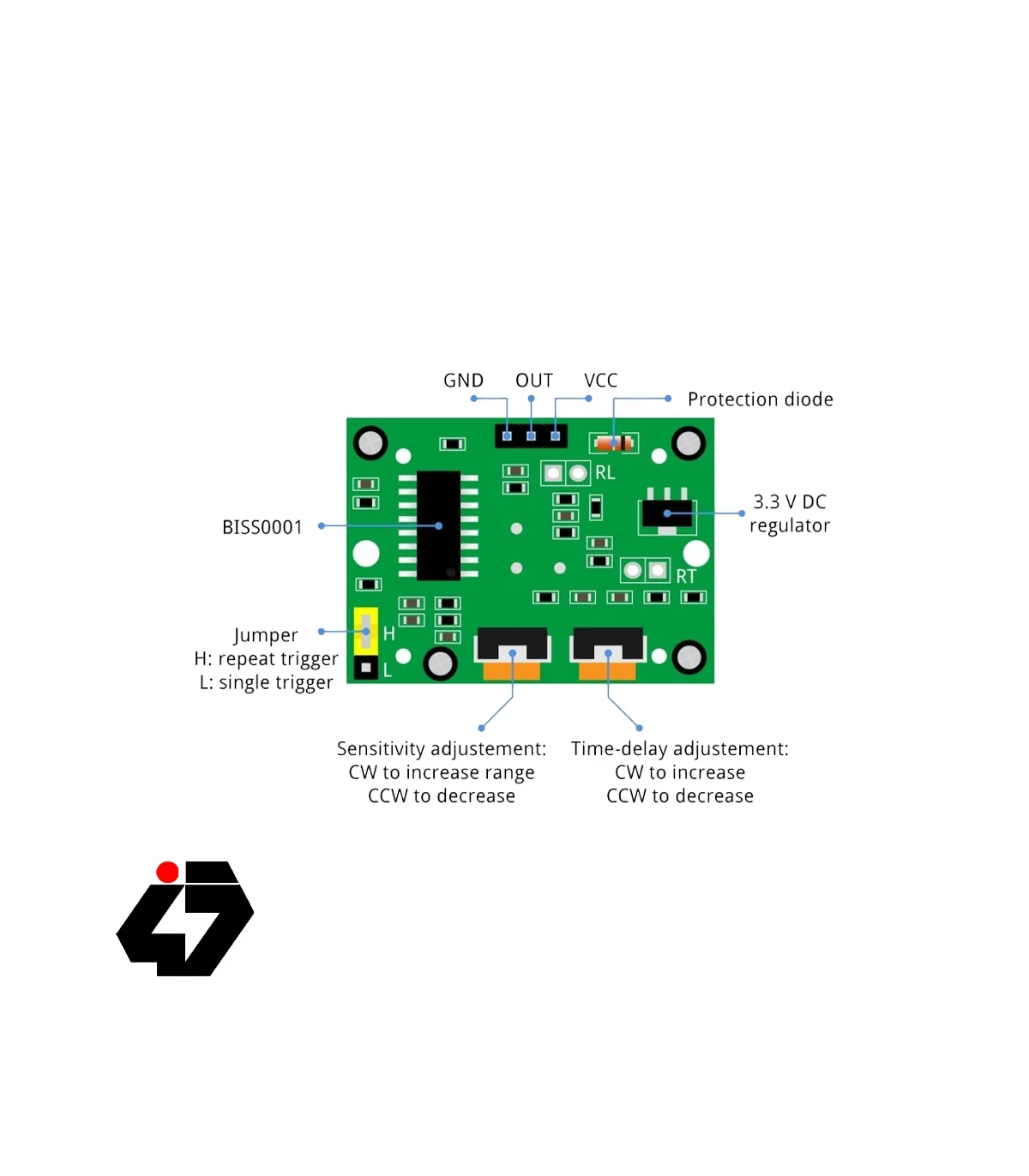 خروجی این سنسور تشخیص حرکت می تواند مستقیما به یکی از پایه های میکروکنترل متصل گردد و در صورت تشخیص هر نوع حرکتی توسط سنسور مقداراین پین یک می گردد. دو پتانسیومتر موجود بر روی برد این امکان را به شما می دهد تا بتوانید حساسیت و زمان انتظار برای ایجاد تاخیر پس از تشخیص یک حرکت را تنظیم نمایید.